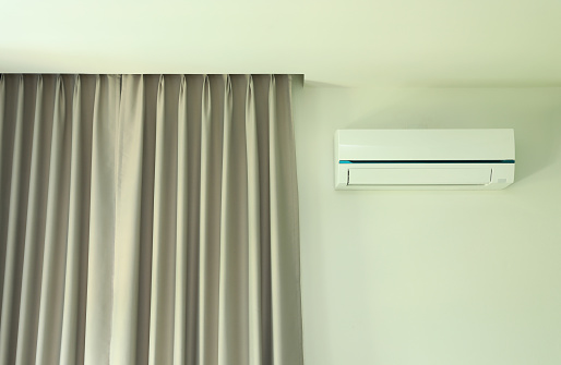 Air Conditioner Wall Type With Curtain In White Wall Room Stock Photo